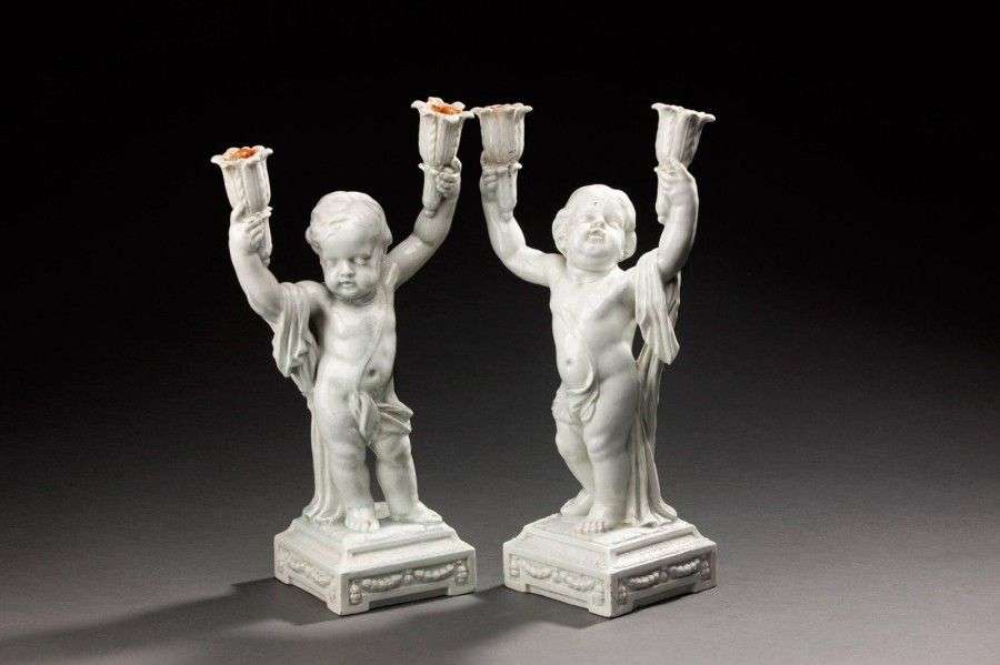 Paire de grands candélabres en faïence fine blanche craquellée et vernissée figurant des enfants drapés et posant sur des socles carrés ornés de guirlandes. H: 39 cm Quelques manques