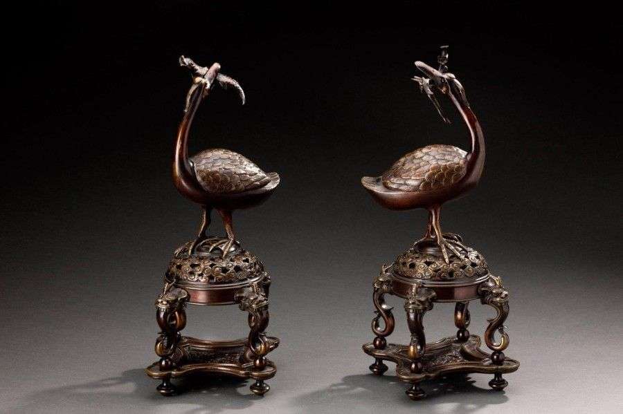 Paire de deux grands brûle-parfums en bronze à patine brune figurant des grues, l'une avec un poisson au bec et la seconde avec une branche fleurie. Elles reposent sur des bases circulaires ajourées à têtes de dragons. Travail asiatique du début du XXème siècle H: 40 cm environ