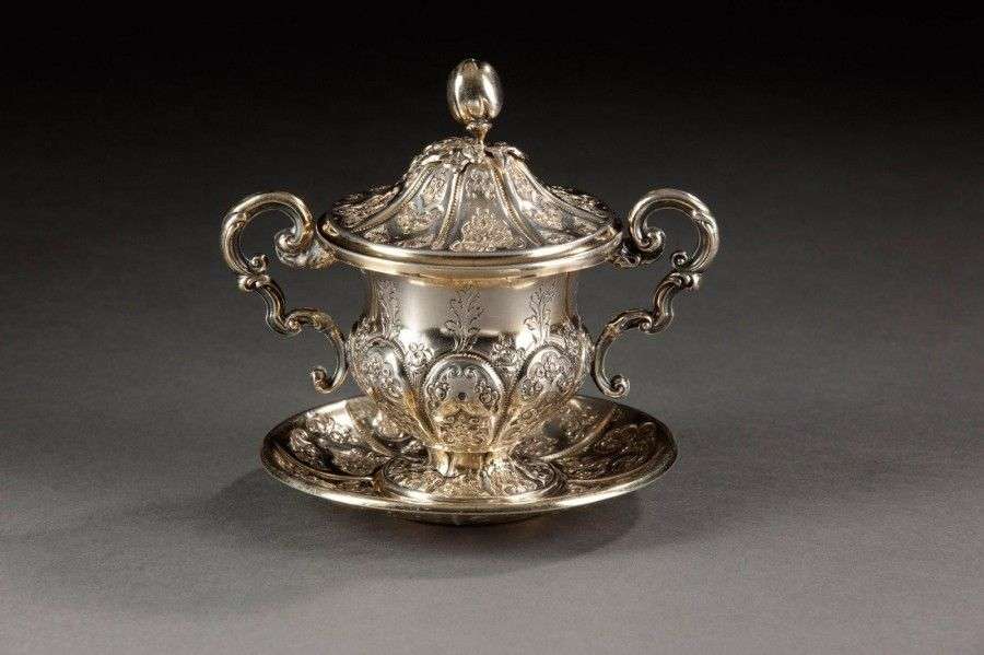 Tasse trembleuse et sa sous-tasse en vermeil richement décorées de fleurs