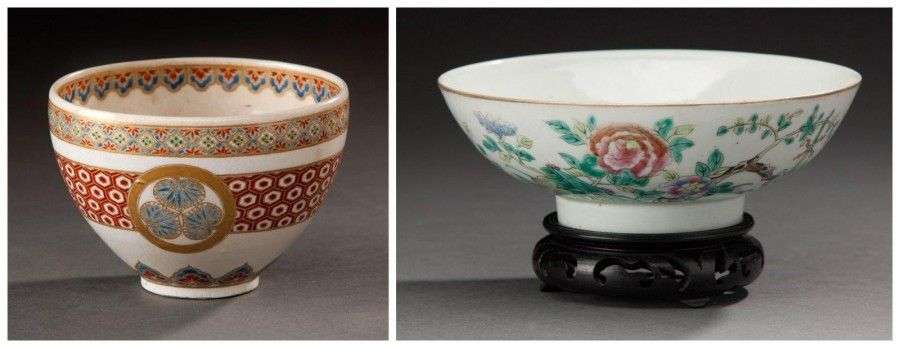 CHINE ET JAPON Ensemble de deux bols, l'un chinois en porcelaine à décor polychrome de branches fleuries sur fond blanc, le second en faïence de Satsuma orné d'un chrysanthème. Marque à plusieurs caractères au revers du bol chinois. Diam.: 11,5 et 18,3 cm