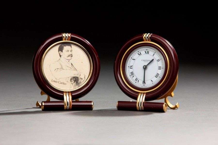 CARTIER Ensemble assorti en métal doré et laque bordeau comprenant: - Un porte-photo circulaire "Les Must de Cartier" - Une pendulette de voyage à quartz à cadran circulaire indiquant les heures en chiffres romain. Dans deux pochettes Cartier. H: 8,5 cm