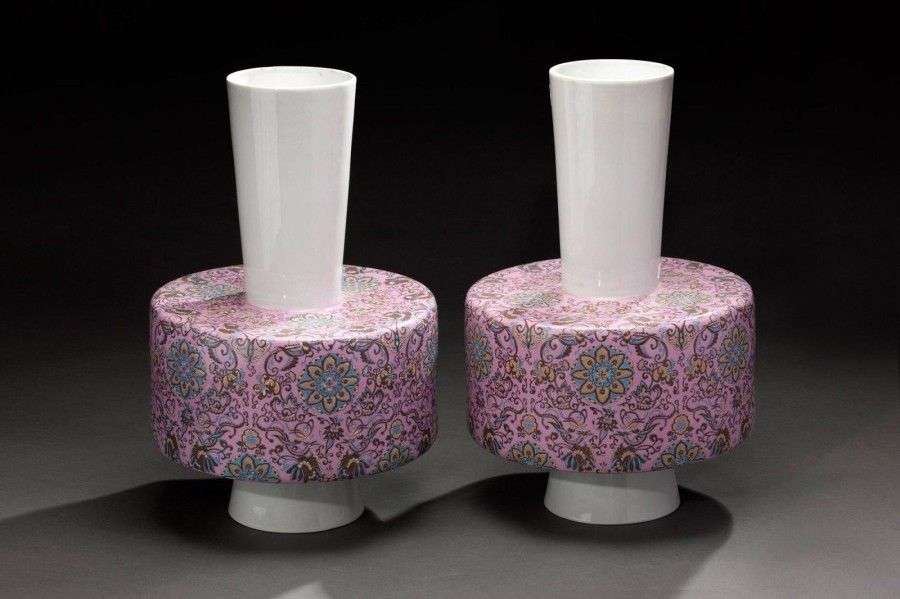Paire d'importants vases lestés en céramique émaillé sur fond rose. Signé Eric ROBIN. H.: 55 cm