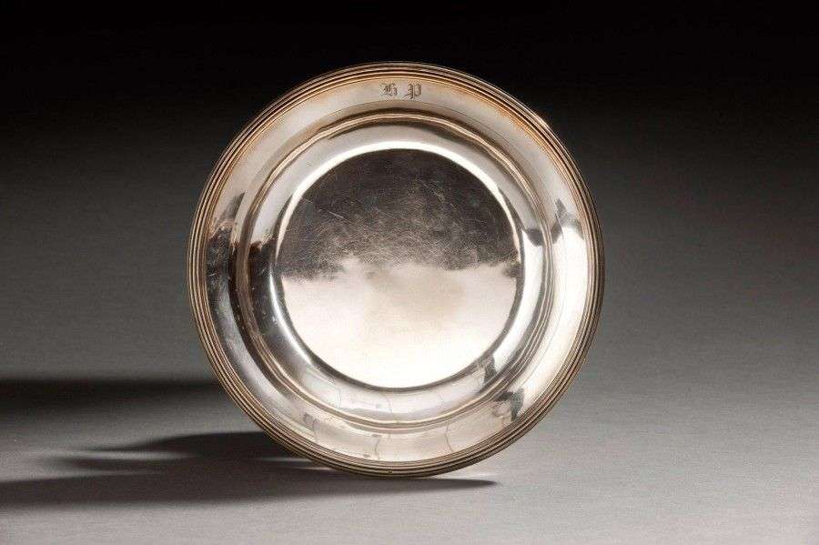 Plat creux en argent circulaire, modèle filets et contours, monogrammé sur