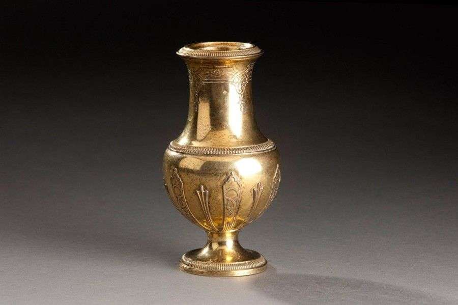 Vase balustre en vermeil sur piédouche au col, pied, et corps godronnés. Poinçon minerve. H.: 17 cm Poids: 266 g