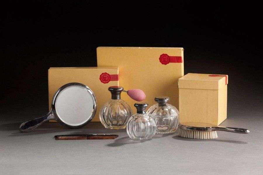 Service de toilette en cristal facetté et montures en argent comprenant deux flacons, un vaporisateur, un miroir, une brosse et un peigne. Trois boîtes d'origine. Travail belge de la maison WOLFERS Frères H. du vaporisateur: 12,5 cm Poids brut total: 2024 g