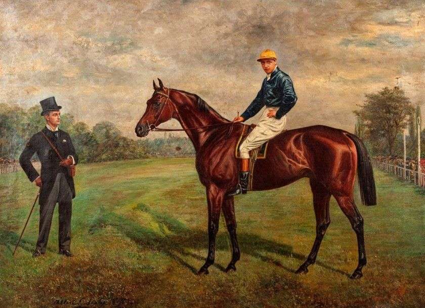 Le jockey, 1898 Huile sur toile, signée et datée en bas à gauche 56 x 76 cm Restaurations anciennes et accidents
