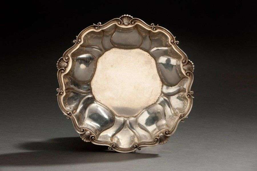 Plat circulaire en argent à bordure chantournée de style rocaille. Titré 8