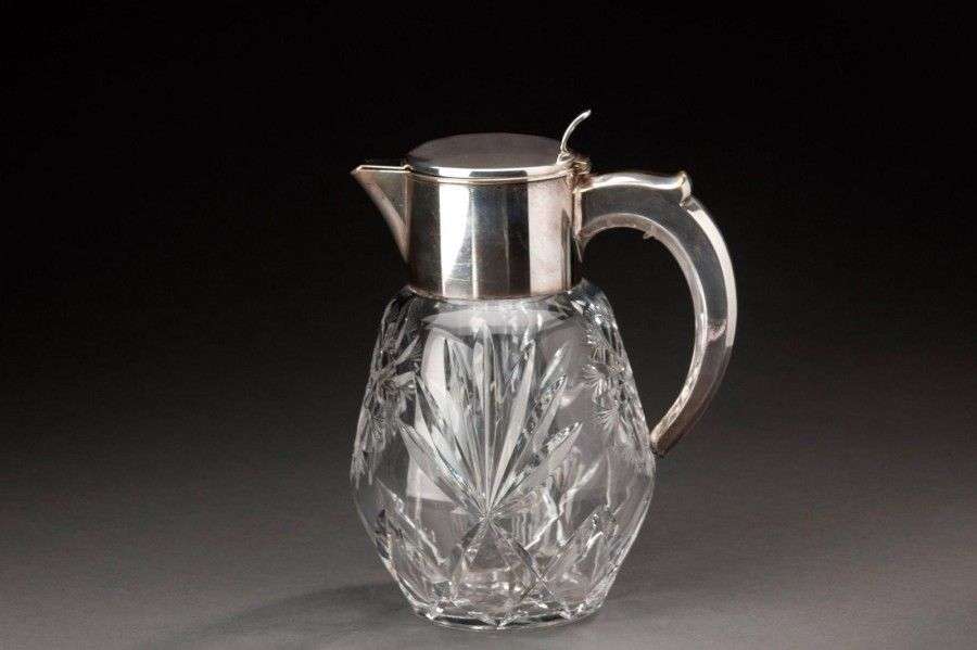 Grande verseuse à orangeade en cristal taillé à décor de feuillages stylisés. Monture en métal argenté. Travail allemand H: 28 cm