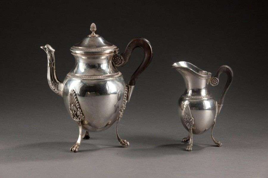 Service en argent de style Empire comprenant une théière et une verseuse à lait, posant sur trois pieds griffes coiffés de palmettes, de forme balustre monogrammée et soulignée d'un liseré de feuilles d'eau, motif repris sur le col et le couvercle. Bec verseur à tête d'aigle et anses en bois noirci. Prise du couvercle de la théière en forme de gland sur un tertre feuillagé. Poinçon minerve Orfèvre: Emile PUIFORCAT H. de la théière: Poids brut total: Petits enfoncements