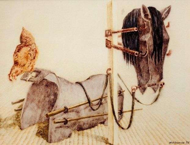 Poule dans l'écurie Dessin au crayon et encre, signé et daté 75 en bas à droite 46 x 59 cm (à vue)