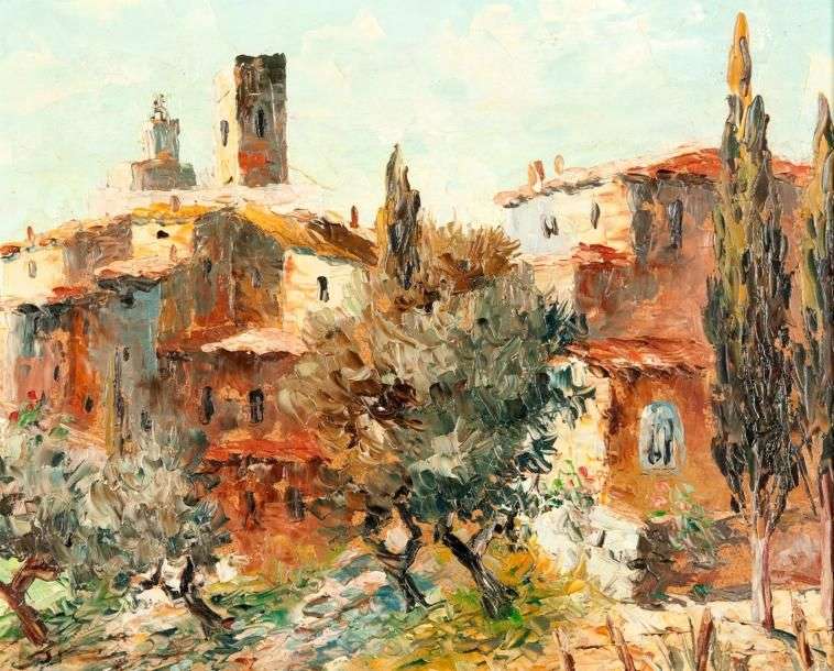 Matin à Saint Paul de Vence Huile sur toile signée en bas à gauche, contresignée, titrée et dédicacée au verso sur le chassis 22 x 27 cm
