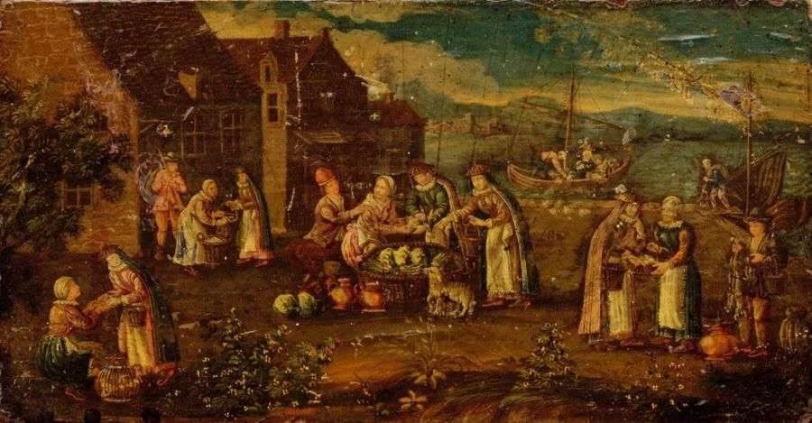 Scène de marché dans un port Parchemin collé sur panneau de chêne 14 x 27 cm (restaurations anciennes)