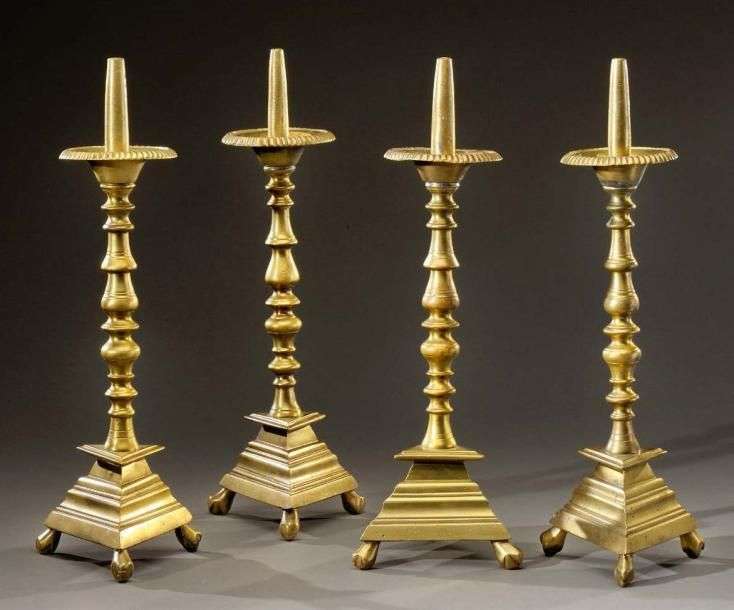 Suite de quatre pique-cierges en bronze doré. Fûts balustre et bases triangulaires à pieds griffes XVIIème siècle H: 44 cm