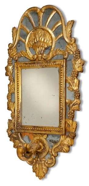 Miroir à parecloses formant applique à un bras de lumière en bois doré mouluré et sculpté de pampres de vigne et corbeille fleurie en fronton. Travail mériodional du XVIIIème siècle H: 105 - L: 57 cm (légers accidents)