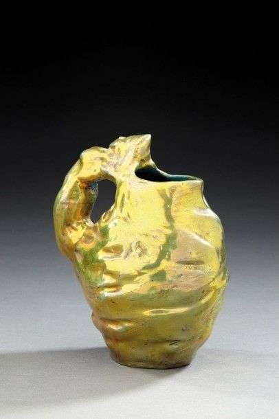 Pichet à corps ovoïde à surface irrégulère en céramique émaillée dorée et irisée et présentant une anse figurant une femme nue. Signé «Zumbo». Vers 1900. H: 17 cm