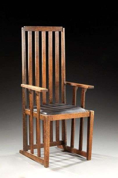 Chaise à haut dossier droit en chêne teinté composé de lattes ajourées. Assise recouverte d'un Skaï noir clouté. H: 120 cm L: 59 cm P: 50 cm
