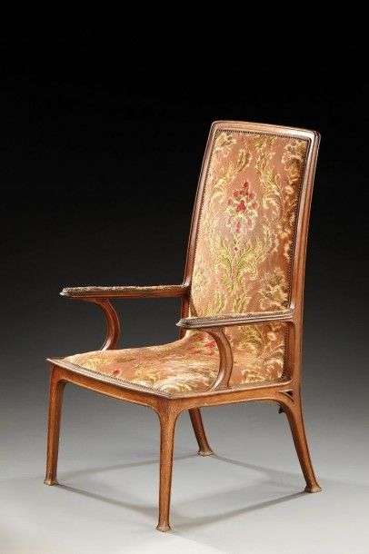 Fauteuil en noyer à dossier droit mouluré et accotoirs plats arrondis reposant sur quatre pieds nervurés et évasés en partie basse. Garniture d'origine recouverte d'un velours polychrome à motif fleoral. Vers 1900. H: 110 cm l: 61 cm P: 67 cm (usures)
