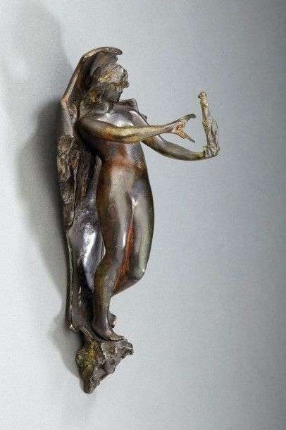 Heurtoir de porte en bronze a patine noire figurant une femme nue tenant un compas et une sculpture dans ses mains. H: 28 cm