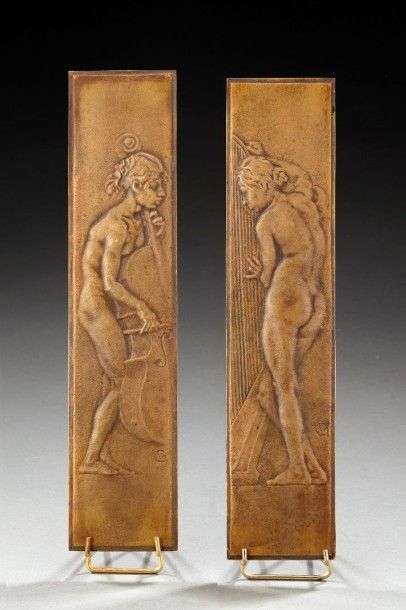 Paire de plaques en bronze figurant deux femmes nues jouant de la harpe et du violoncelle. Monogrammées en bas à droite. Vers 1900. H: 29,5 cm L: 7 cm