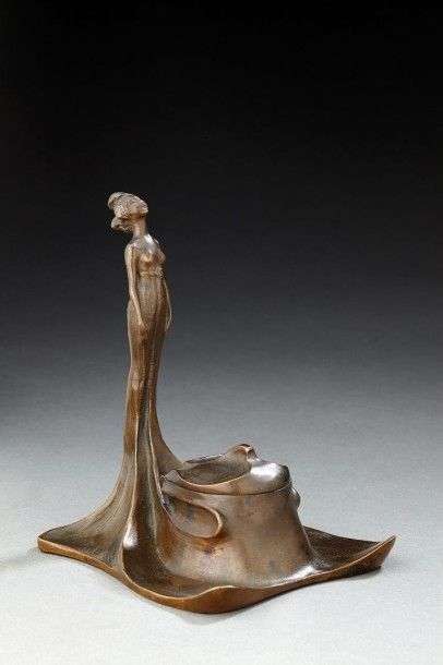 Encrier en bronze à patine brune figurant une jeune femme nue. H: 14,5 cm