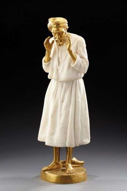 Importante sculpture en bronze à patine dorée et marbre blanc figurant un sujet orientaliste. Signée sur la terrasse «Bofill», porte le cachet du fondeur «Unis Paris» et monogramme. Fonte d'édition ancienne, vers 1900-1910. H: 63 cm