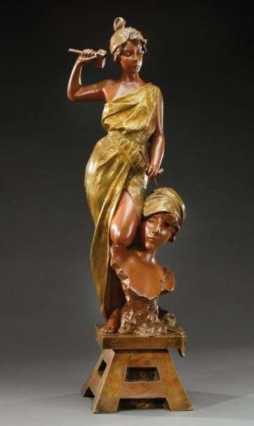Sculpture en bronze à patine cuivrée, verte et dorée figurant une femme sculpteur avec à ses pieds un buste. Elle repose sur une base orientable imitant une sellette de sculpteur. Fonte d'édition ancienne, vers 1895. Signée «E.Villanis». H: 74 cm
