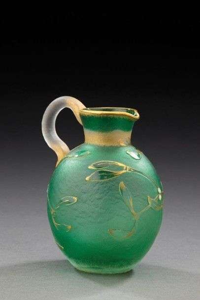 Verseuse à panse bombée et colétranglé pincé en verre doublé teinté vert à décor dégagé a l'acide de branches de gui rehaussé de dorure et d'émail blanc sur fond givré. Elle présente une anse appliquée à chaud. Signature à l'or «Daum Nancy». Vers 1900. H: 11 cm