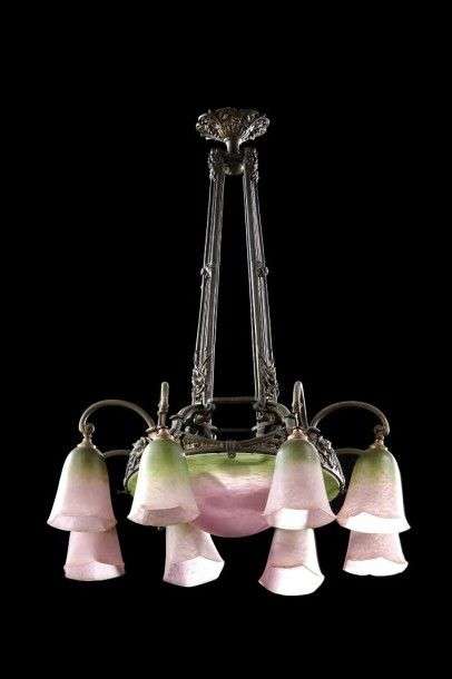Lustre à armature en laiton à patine verte présentant huit bras de lumière à décors de motifs floraux enserrant une casque centrale et huit tulipes en verre marmoréen rose nuancé vert. Signé «Schneider». Vers 1920. H: 80 cm Diam: 53 cm