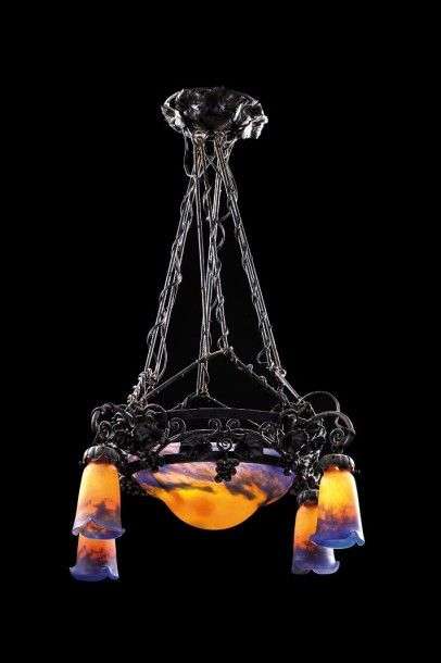 Lustre à armature en fer forgé à patine noire présentant quatre bras de lumière à décor ajouré de motifs floraux enserrant une vasque centrale et quatre tulipes en verre marmoréen orange nuancé bleu. Signé «Muller Frères Lunéville». Vers 1920. H: 95 cm Diam: 70 cm