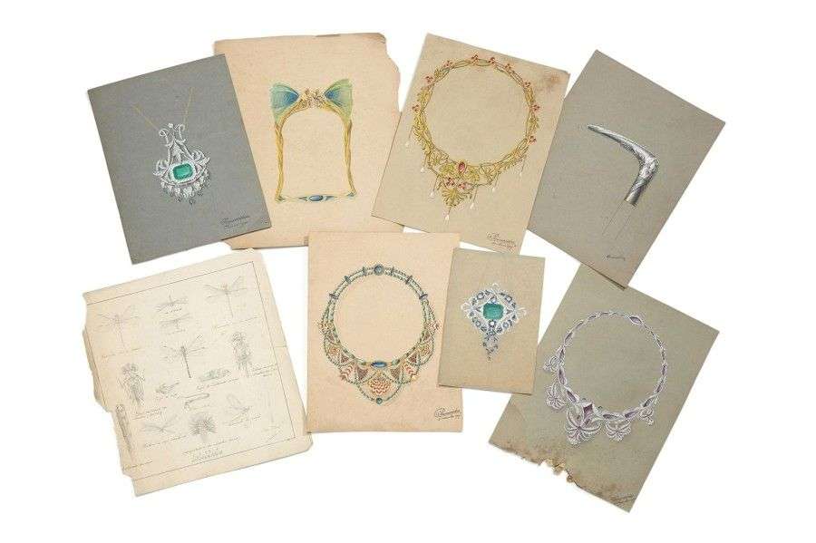 Suite de sept dessins polychromes à la gouache figurant des bijoux. On y joint un dessin à la pointe sèche et rehaut de polychromie figurant différentes vues d'une libellule. Signés et quelques uns datés 1907 et 1908. Dimensions: 24 x 23 cm (déchirures et taches)