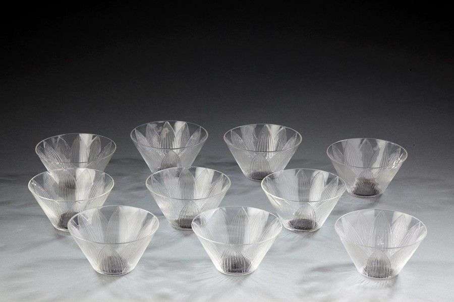 Suite de dix bols à main «Lotus» en verre soufflé-moulé patiné noir. Signés «R.Lalique». Modèle créé en 1923. H: 6,5 cm Diam: 12 cm