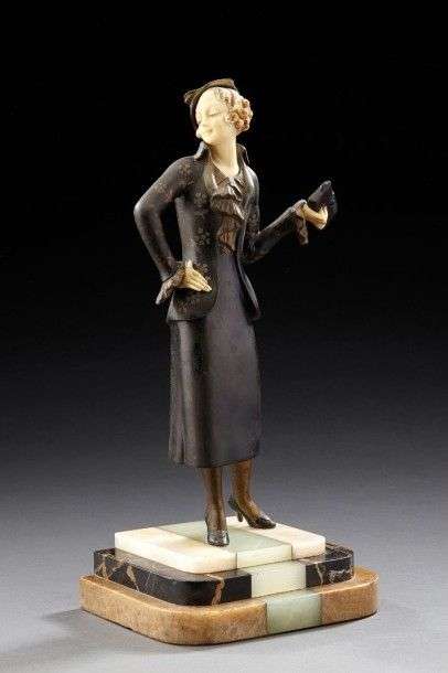 Sculpture chryséléphantine en bronze polychrome et ivoire figurant une élégante portant un sac. Elle repose sur un base à gradin en onyx et marbre. H: 34cm L: 16 cm (parties décollées)