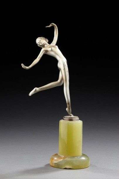 Epreuve en bronze à patine argentée figurant une danseuse. Elle repose sur une base cylindrique à gradin en onyx vert nuancé beige. Signée «Lorenzl».et marquée «Véritable bronze». Fonte d'édition ancienne vers 1920-1930. H: 26 cm (déformations et éclats)