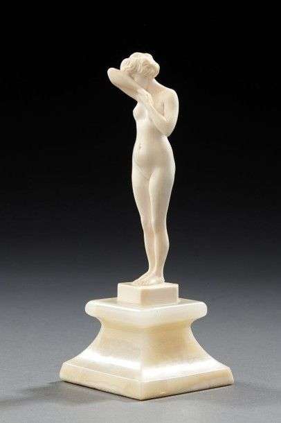 Sculpture en taille directe sur ivoire figurant une femme nue se couvrant le visage. Elle repose sur une base pyramidale en onyx beige. Vers 1920. H: 16 cm (légers éclats)