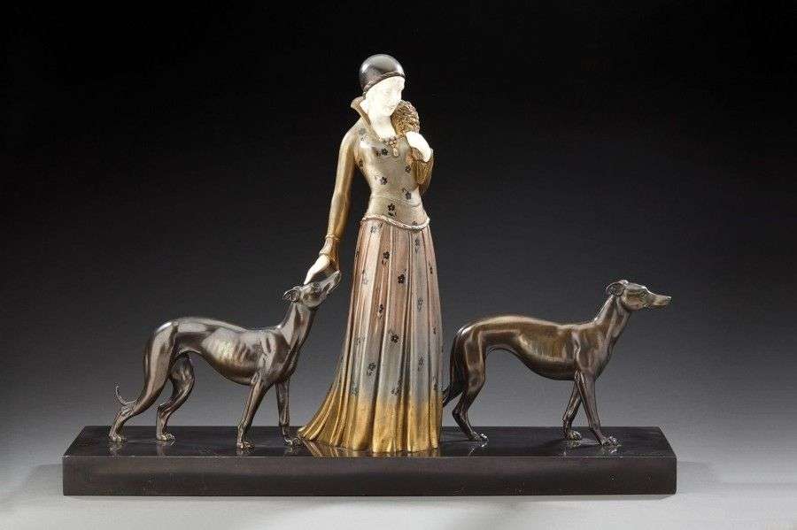 Epreuve en régule patiné argent et noir et matière synthétique figurant une femme aux deux lévriers reposant sur une base en marbre noir. Signée à la pointe «D.H.Chiparus». Fonte d'édition ancienne, vers 1930. H: 43,5 cm L: 60 cm P: 16 cm (éclats au marbre)
