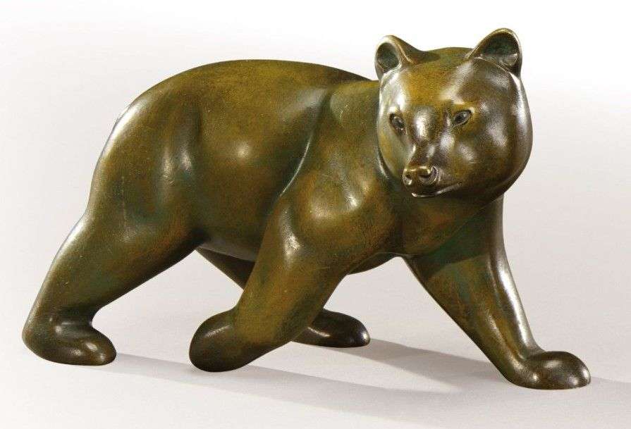 Epreuve en bronze zoomorphe à patine verte figurant un ours. Signée «I.Rochard». Vers 1940. H: 12,5 cm L: 20,5 cm