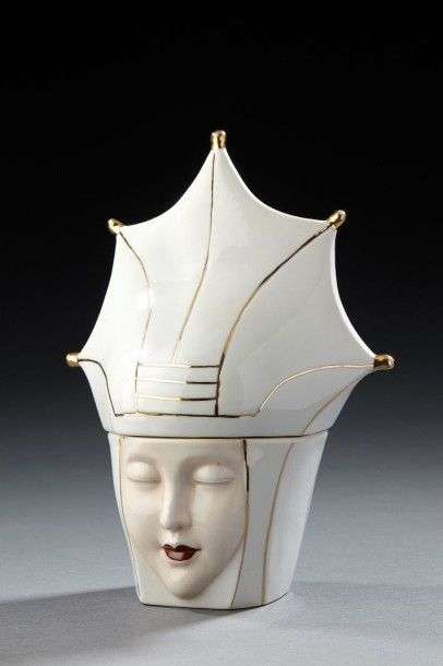 Pot couvert en porcelaine émaillée polychrome figurant une tête de femme et une couronne. Signé «Robj Paris Made in France». Vers 1930. H: 20 cm