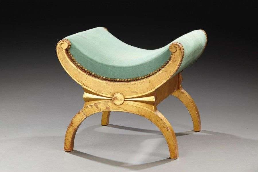 Tabouret curule en bois sculpté et doré. Assise recouverte d'un tissu vert. H: 46 cm L: 51 cm P: 51,5 cm (rayures et usures)