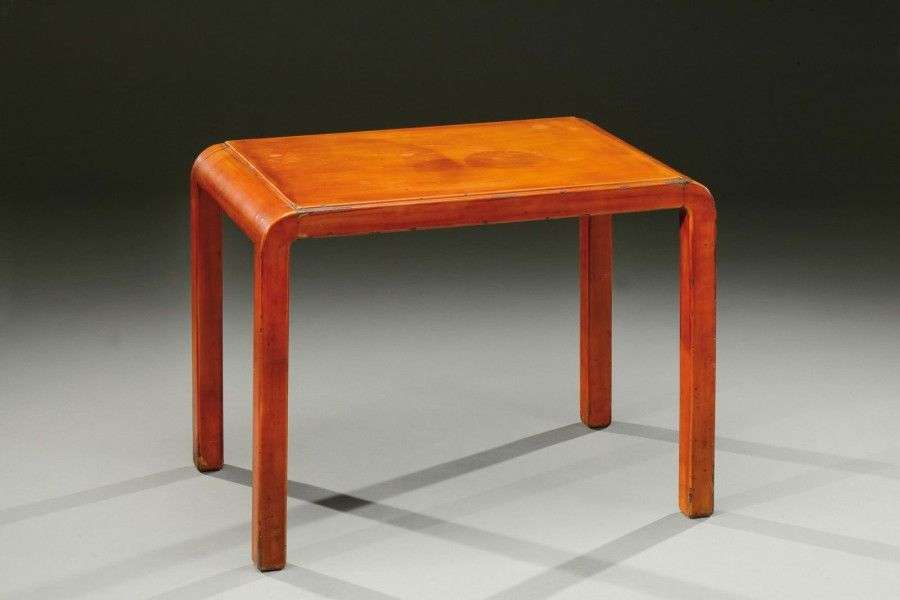 Table basse d'appoint en bois laqué orange nuagé à plateau rectangulaire reposant sur quatre pieds quadrangulaires. Numérotée. Vers 1930-1935. H: 46 cm L: 59 cm P: 40 cm (usures et sauts de laque)