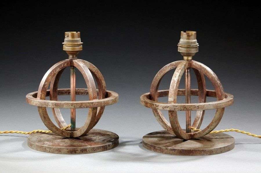 Paire de lampes en fer forgé figurant des sphères ajourées reposant sur une base circulaire. Signées du cachet «E.Brandt». Vers 1930. H: 17,5 cm Diam: 14,5 cm