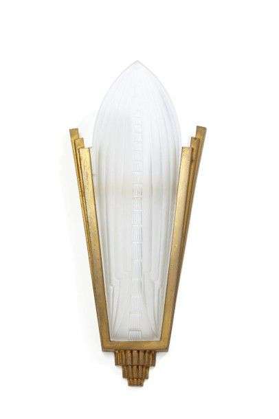 Applique murale à armature en «V» à gradins godronnés enserrant un réflecteur en verre moulé-pressé satiné. Monogrammée «GM France». Vers 1930. H: 50 cm l: 21 cm P: 10 cm