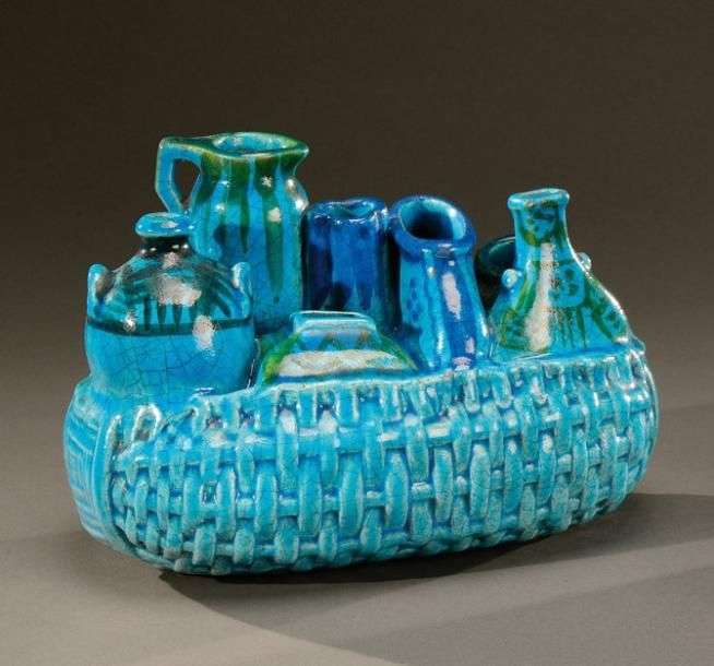 Sculpture formant pique-fleurs en céramique émaillée bleue turquoise craquelée à nuances vertes et jaunes figurant un panier tressé remplis de vases de différentes formes. Signée et monogrammée «Lachenal». Vers 1900-1920. H: 16 cm L: 23 cm P: 15 cm (infimes éclats)