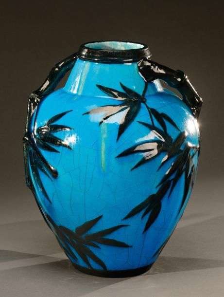 Important vase à corps ovoïde et col resserré en céramique émaillée bleue craquelée à décor en relief de branches de bambou feuillagés noires formant anses. Signé et monogrammé «Lachenal». Modèle réalisé entre 1893-1911. H: 31.5 cm