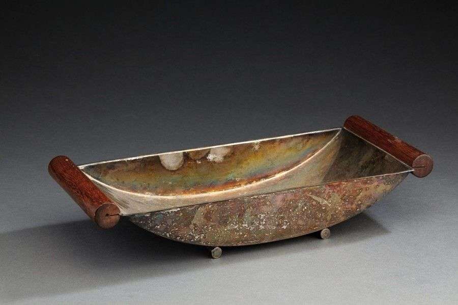 Vide-poches moderniste en métal argenté et palissandre. L: 32 cm l: 14 cm
