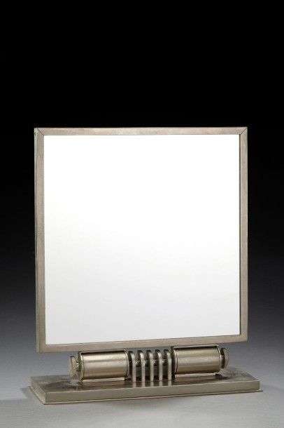 Miroir de table moderniste orientable à structure en métal nickelé reposant sur un axe tubulaire à décor de lames ajourées terminées par une base rectangulaire. Il enserre une glace quadrangulaire. Signé «Desny Paris Made in France déposé». Vers 1930. H: 35 cm L: 30,5 cm P: 11 cm