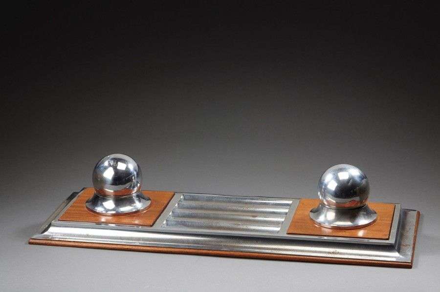 Important encrier de bureau moderniste de forme rectangulaire en métal chromé et acajou présentant deux réceptacles formant encrier à couvercles sphériques. Vers 1930. L: 68 cm