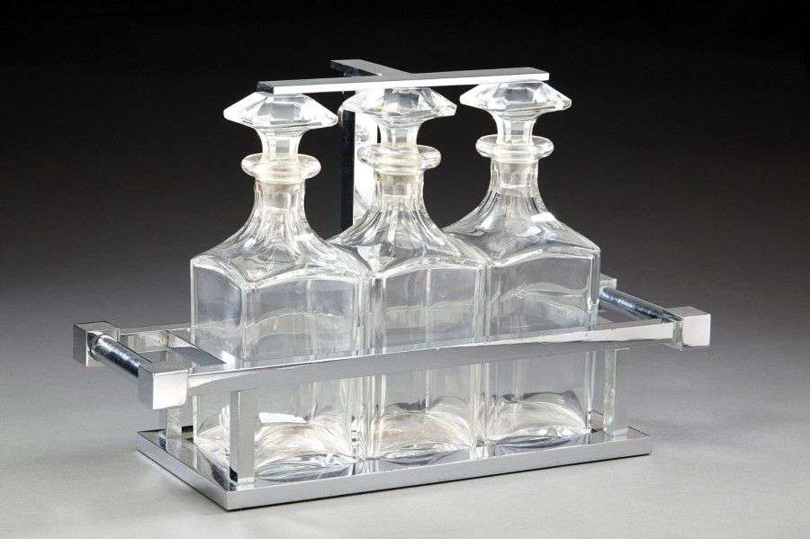 Suite de trois carafes en verre translucide reposant dans un présentoir à armature quadrangulaire ajourée en métal chromé à fond miroir. Carafes marquées du tampon baccarat. Vers 1930-1940. H: 20 cm (carafe)