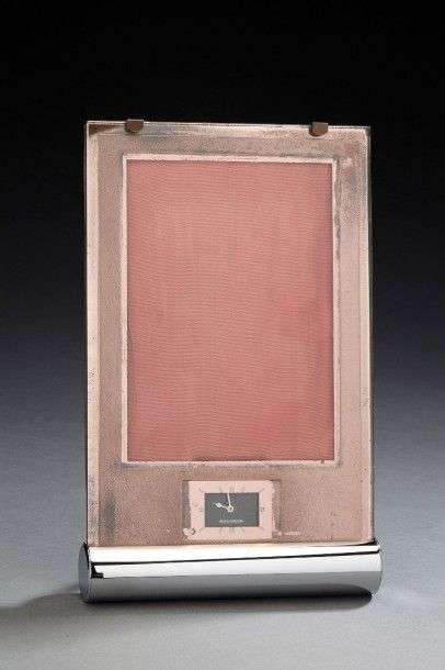 Porte photo rectangulaire en verre à patine cuivrée reposant sur une structure en métal tubulaire chromé enserrant une horloge. Marqué "Jaeger-Le Coultre". Vers 1930. H: 27,5 cm