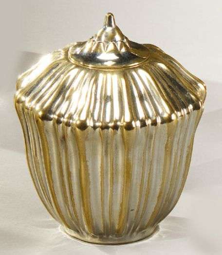 Boîte couverte de forme coloquinte en bronze argenté à motifs rainurés. Signée du cachet "Cuillere". H: 13,5 cm