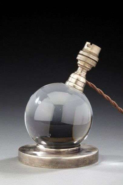 Lampe de table moderniste composée d'une boule de verre pivotante sur une base circulaire en métal nickelé. Vers 1930. H: 19cm